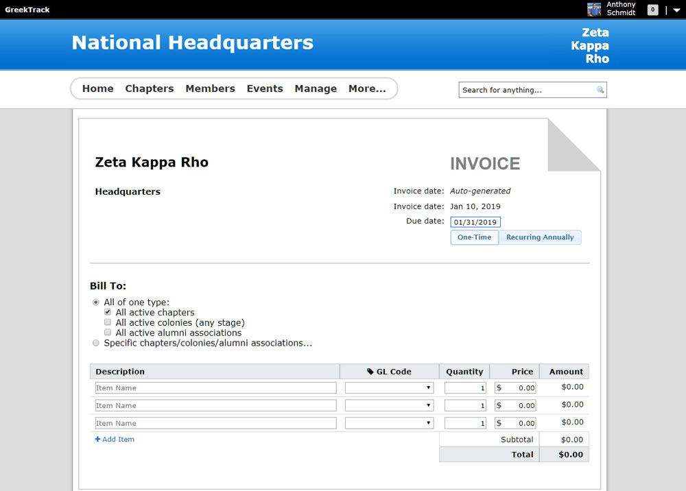 Easily create invoices or invoice templates for all or specific chapters or members using GreekTrack's Invoice Generator.